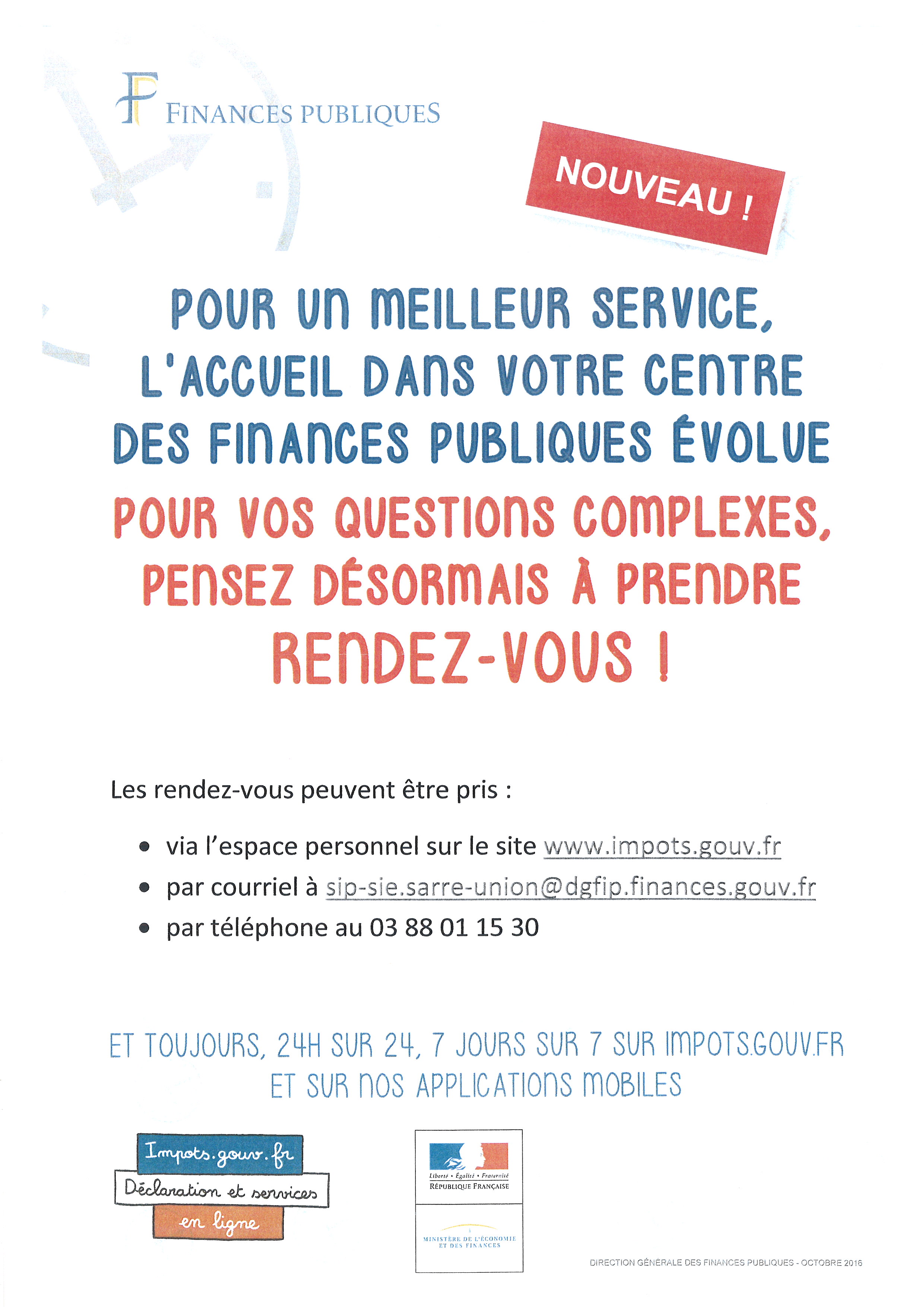 lundi, mardi et jeudi de 8h30 à 12h et de 13h30 à 16h sans rendez-vous (simples démarches consistant à déposer un paiement ou un formulaire sans solliciter de conseil ou d'explication)